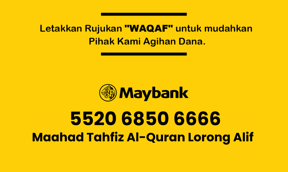 Semoga Tuan/Puan dapat menyumbang sekarang dengan ikhlas hati kerana Allah Ta’ala.InshaAllah kami di Maahad Tahfiz Al-Quran mendoakan Tuan/Puan semoga dimudahkan segala urusan dan dilimpahkan rezeki dan kelapangan untuk terus beramal kerana Allah.