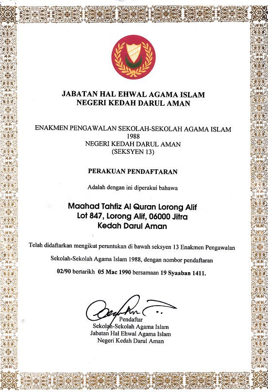 Maahad ini berdaftar dengan Jabatan Agama Islam Negeri Kedah Darul Aman dibawah Seksyen 12 (1) (2) Enekmen Pengawalan Sekolah Agama Islam Bil 8 (198). Ianya telah didaftarkan pada 19 Syaaban 1411H bersamaan 5 Mac 1990. (No. Pendaftaran : 2/90).